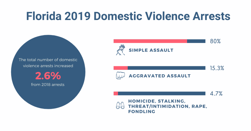 The remaining 4.7% of domestic violence arrests in 2019 consisted of threat, intimidation, stalking, as well as violent crimes such as aggravated stalking, murder, manslaughter and sexual assault / sexual battery.