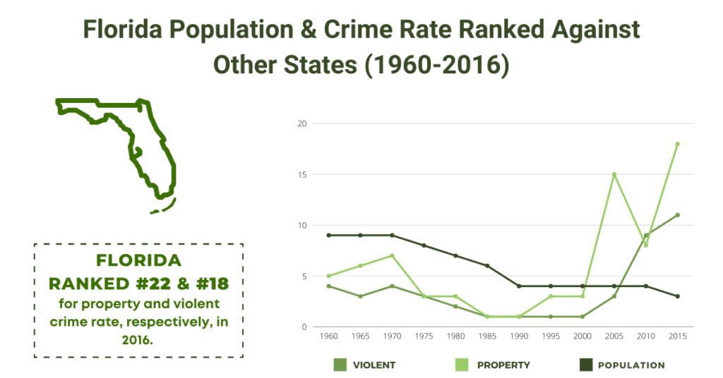 Since 1960, both the violent and property crime rates respective rankings for Florida were there at their lowest in 2016. During this time, the property crime rate ranked 22 and violent crime was 18th.