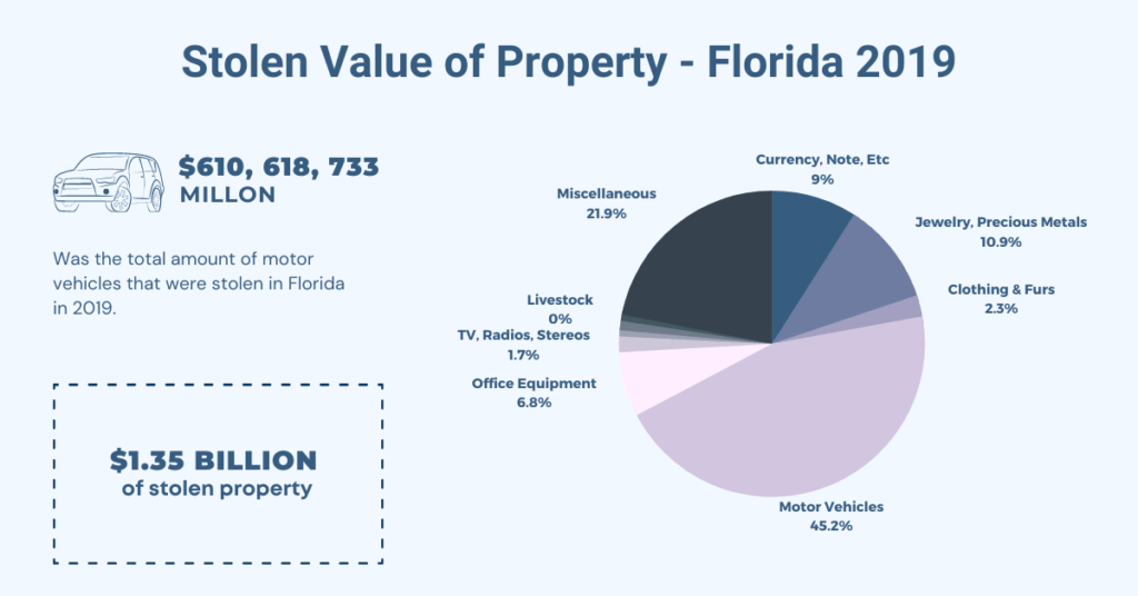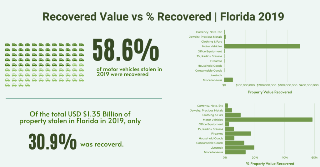 - Of the total USD $1.35 Billion of property stolen in Florida in 2019, only 30.9% was recovered.