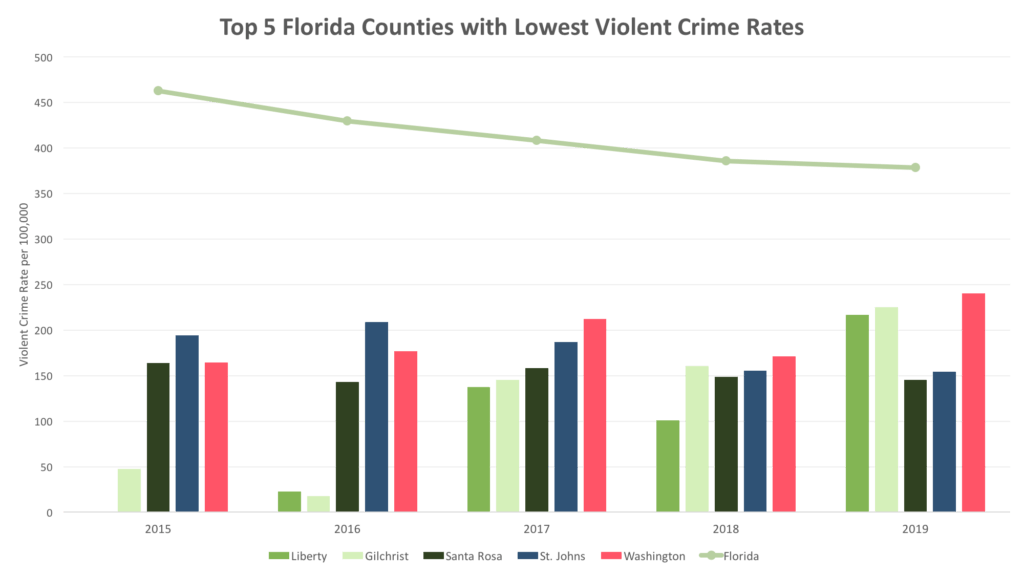 - It should be noted that Liberty reported no violent crimes rate in 2015 and therefore contributed to the lowest violent crime rate for Florida counties at 95.6 per 100,000.