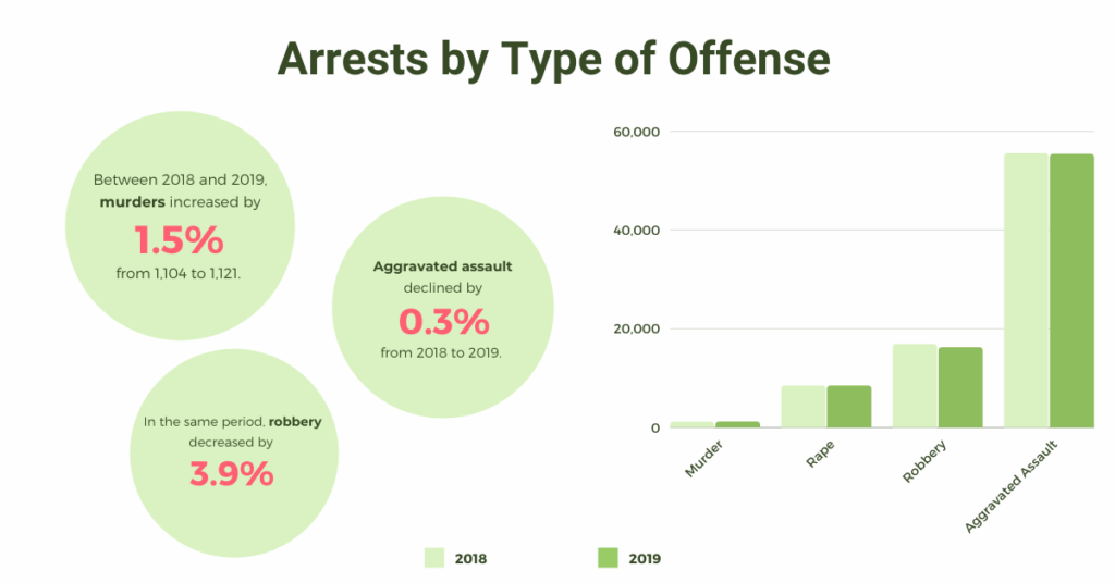 - Between 2018 and 2019, murders increased by 1.5% from 1,104 to 1,121.