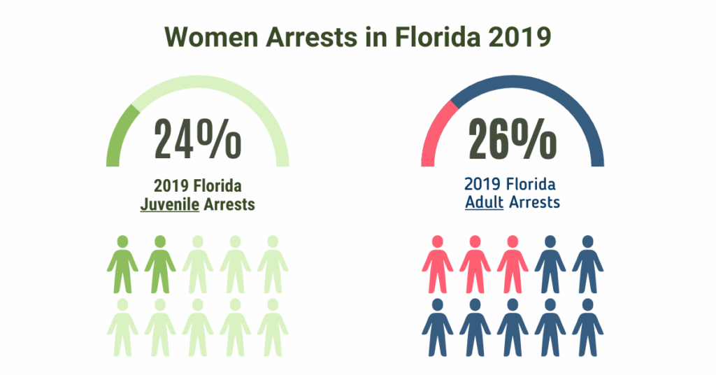 Adult Female arrests totaled 164,784 while female juvenile arrests were 10,721, representing 26% and 24% of 2019 Florida adult and juvenile female arrests, respectively.