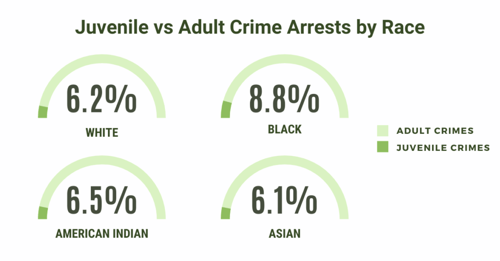 The difference between the percentage of juvenile/adult arrests is smaller by race compared to gender segmentation. The graphic above shows the number of arrests for juveniles out of the total arrests by race.