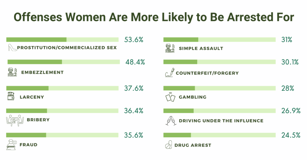 There is a distinct difference in the types of crimes where women make up a larger portion of the arrests. The majority of offenses where arrests constitute a higher portion of females are for non-violent crimes, as shown below.